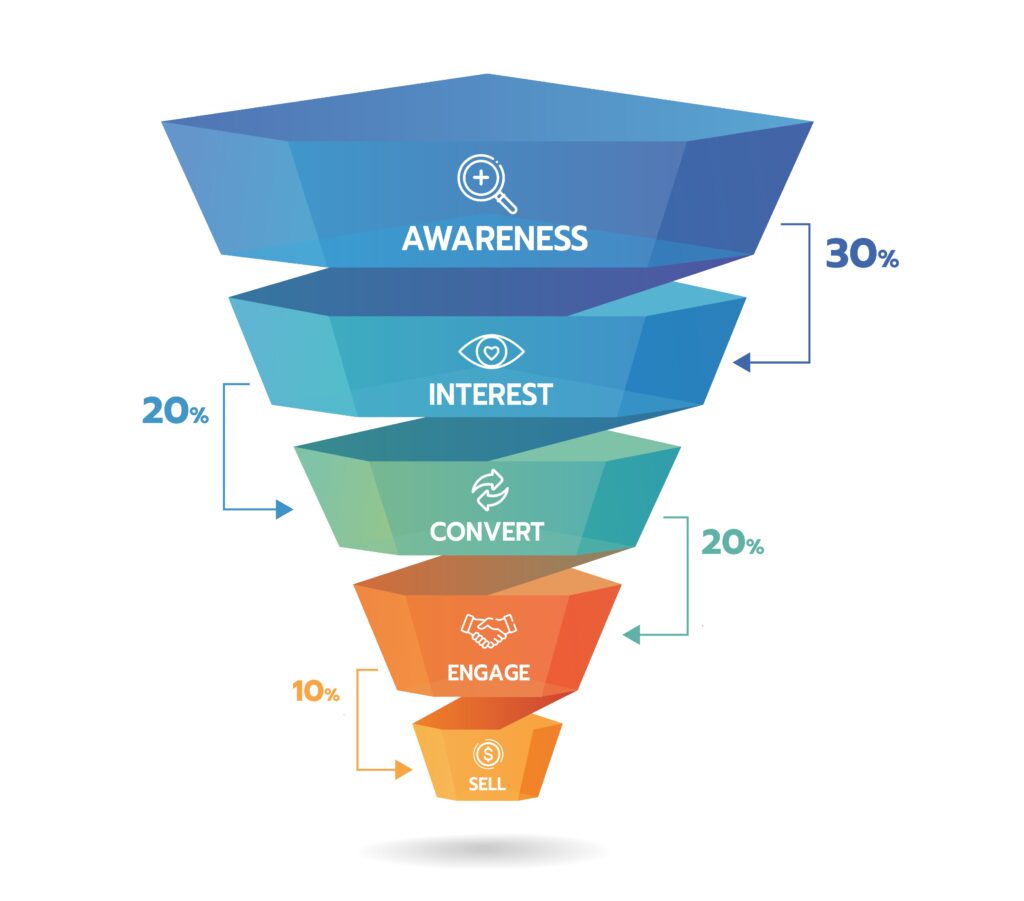 Concettualmente, un Marketing Funnel è un modello visivo e analitico che rappresenta la riduzione progressiva dei contatti man mano che l’engagement aumenta. E’ disegnato come una piramide rovesciata perché il numero di persone diminuisce mentre la qualità della relazione aumenta.